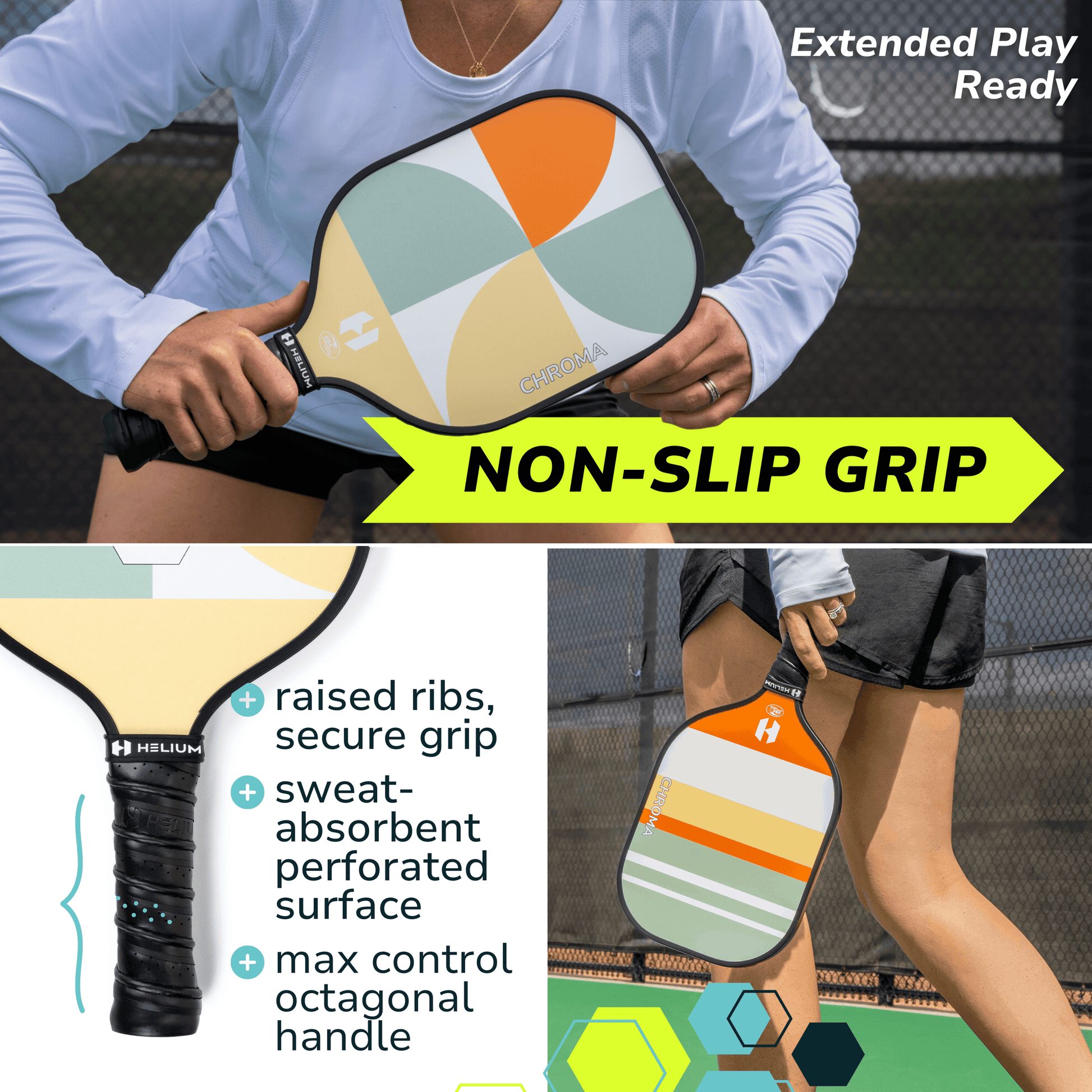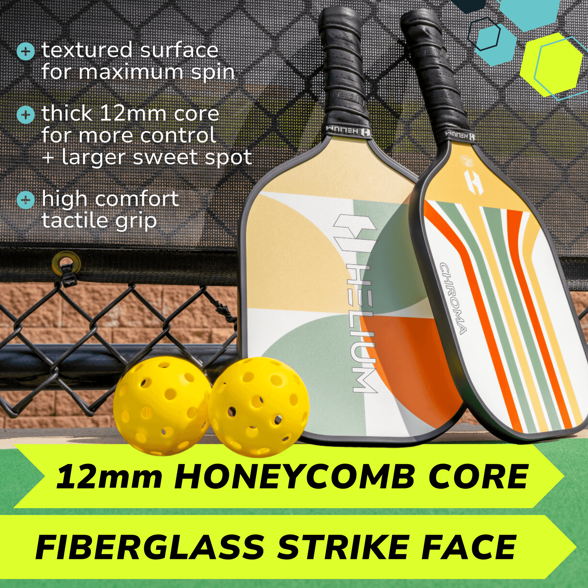 Each Chroma pickleball paddle is made with a fiberglass face which generates more control and power in each swing. The polypropylene honeycomb core makes the paddle light. Strike the optimal balance of power and control with the dynamic Chroma pickleball paddle.