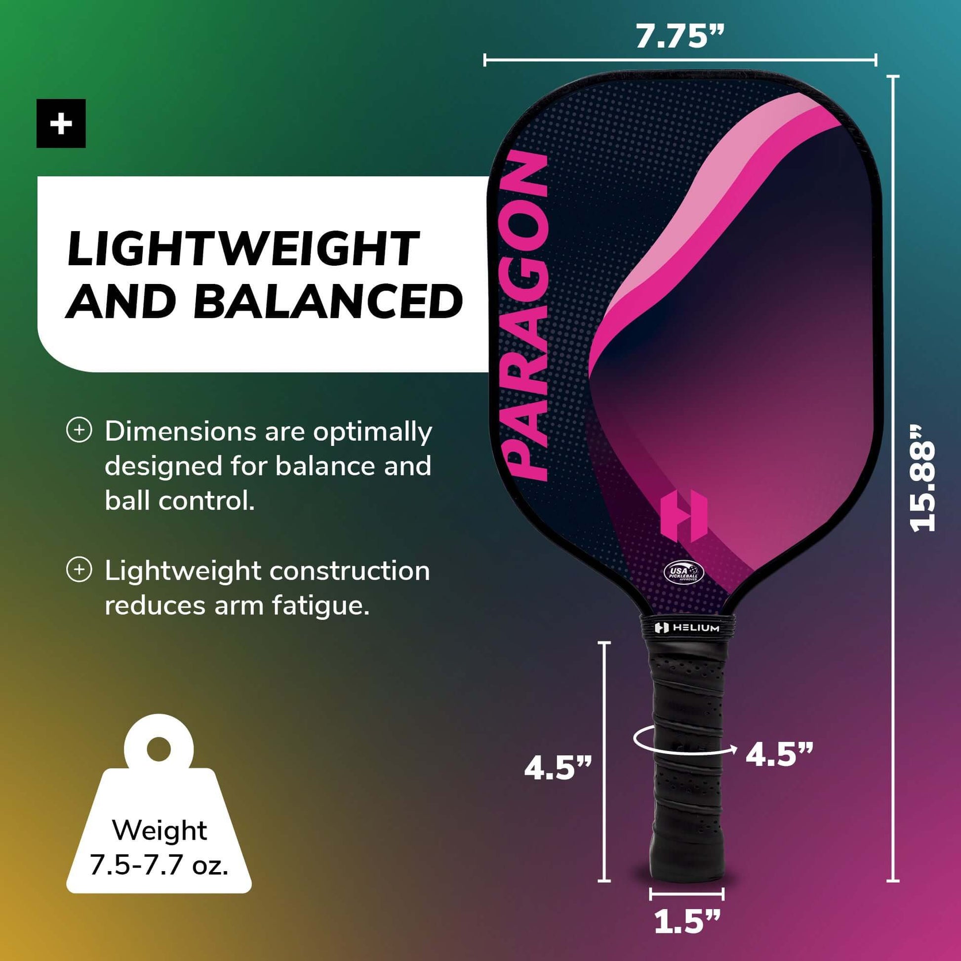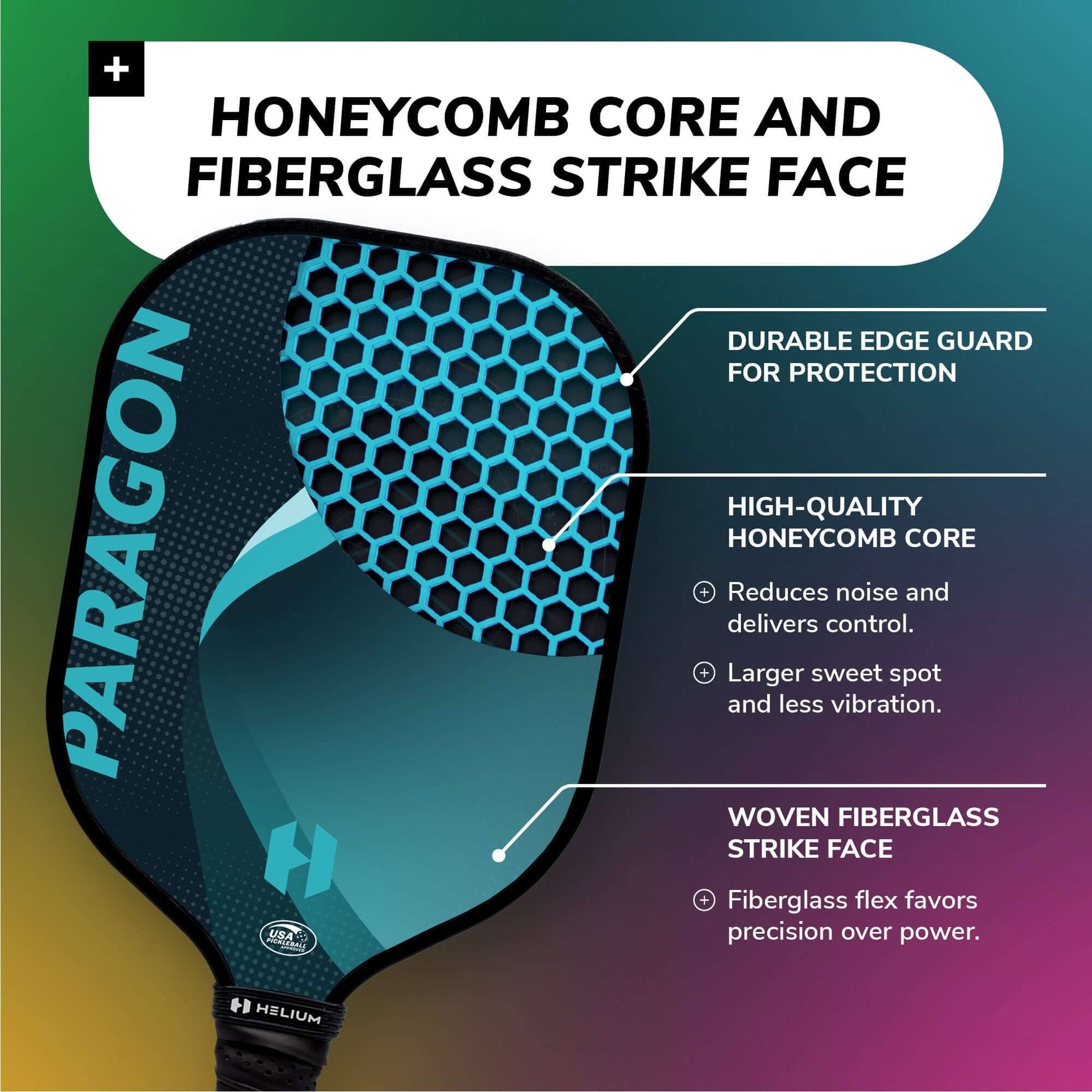 Each Paragon pickleball paddle is made with a fiberglass face which generates more control and power in each swing. The polypropylene honeycomb core makes the paddle light. Strike the optimal balance of power and control with the dynamic Paragon pickleball paddle.