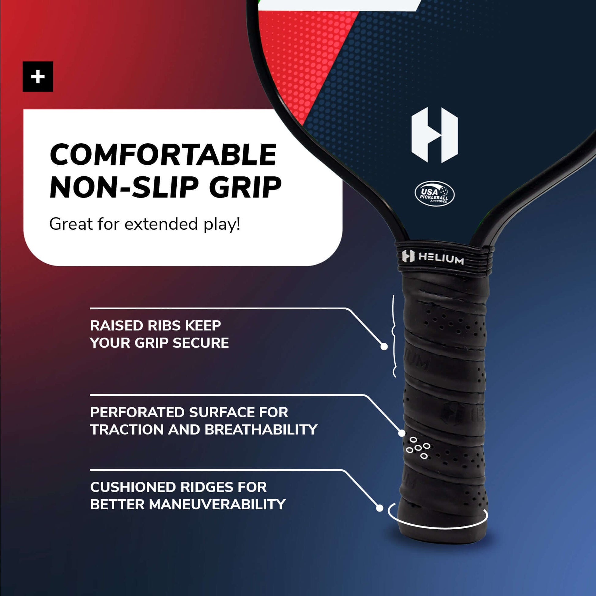 Each Patriot pickleball paddle is made with a fiberglass face which generates more control and power in each swing. The polypropylene honeycomb core makes the paddle light. Strike the optimal balance of power and control with the dynamic Patriot pickleball paddle.