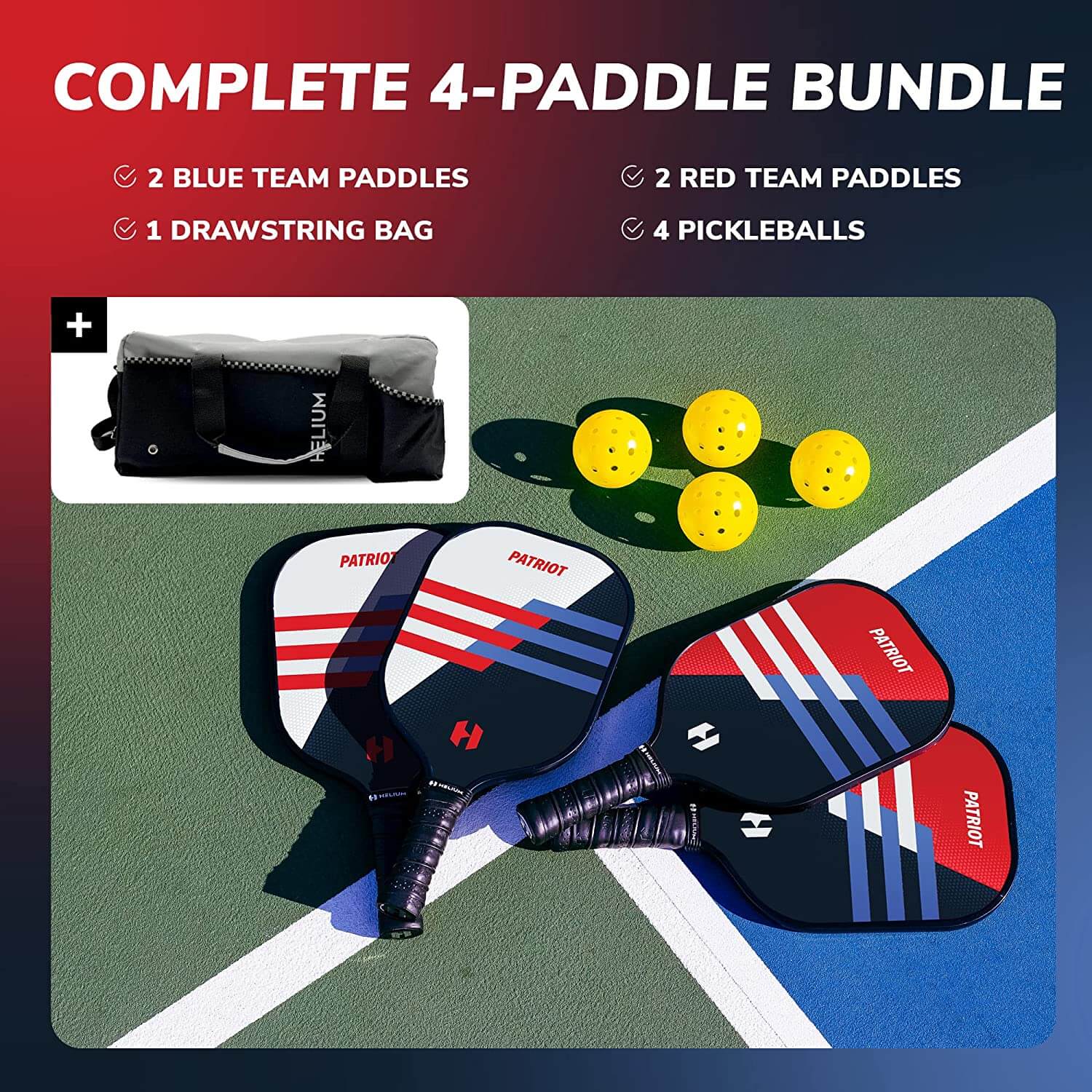 Our paddle set has 4 vibrant sporty colors so you can play with your favorite paddle. Get to your nearest court and Elevate Your Game with Helium!